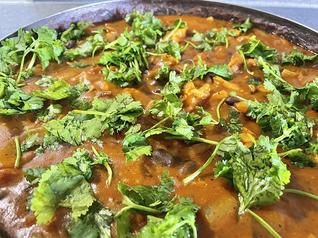 Garnish with fresh cilantro. Serve hot with 1 cup cooked rice and 1 naan per person.