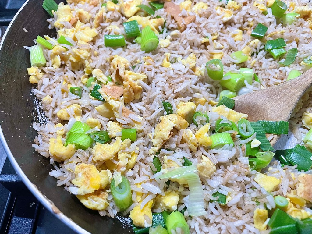 • Add the cold rice and stir-fry for 1–2 minutes, breaking up clumps.