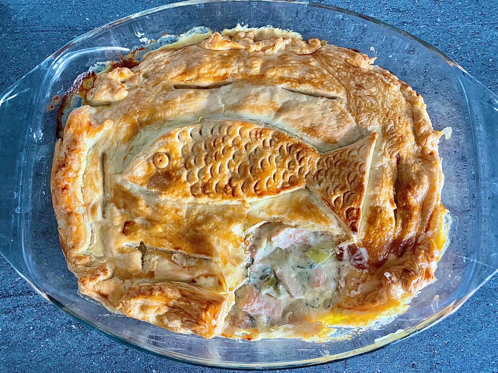 - Spoon the creamy salmon mixture into a large baking dish (roughly 30×20 cm / 12×8 inches).